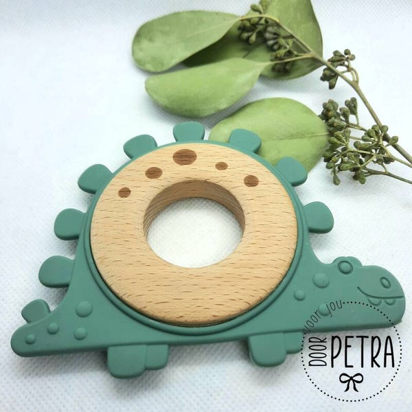 Hoe leuk is deze stoere dino! De bijtring is gecombineerd met hout en siliconen, waardoor deze ideaal is bij doorkomende tandjes.