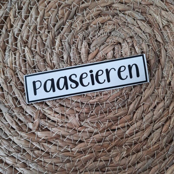 Versier de pot, trommel en bak waar de paaseieren in zitten met deze sticker! Er zijn twee varianten. Het handschrift (bovenste) en de blokletters (onderste).